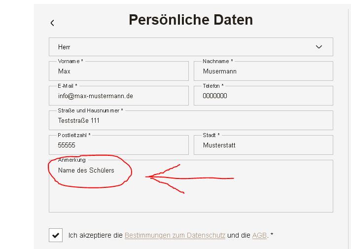 Bitte tragen Sie bei der Reservierung im Feld "Anmerkungen" unbedingt den Namen der Schülerin oder des Schülers ein!