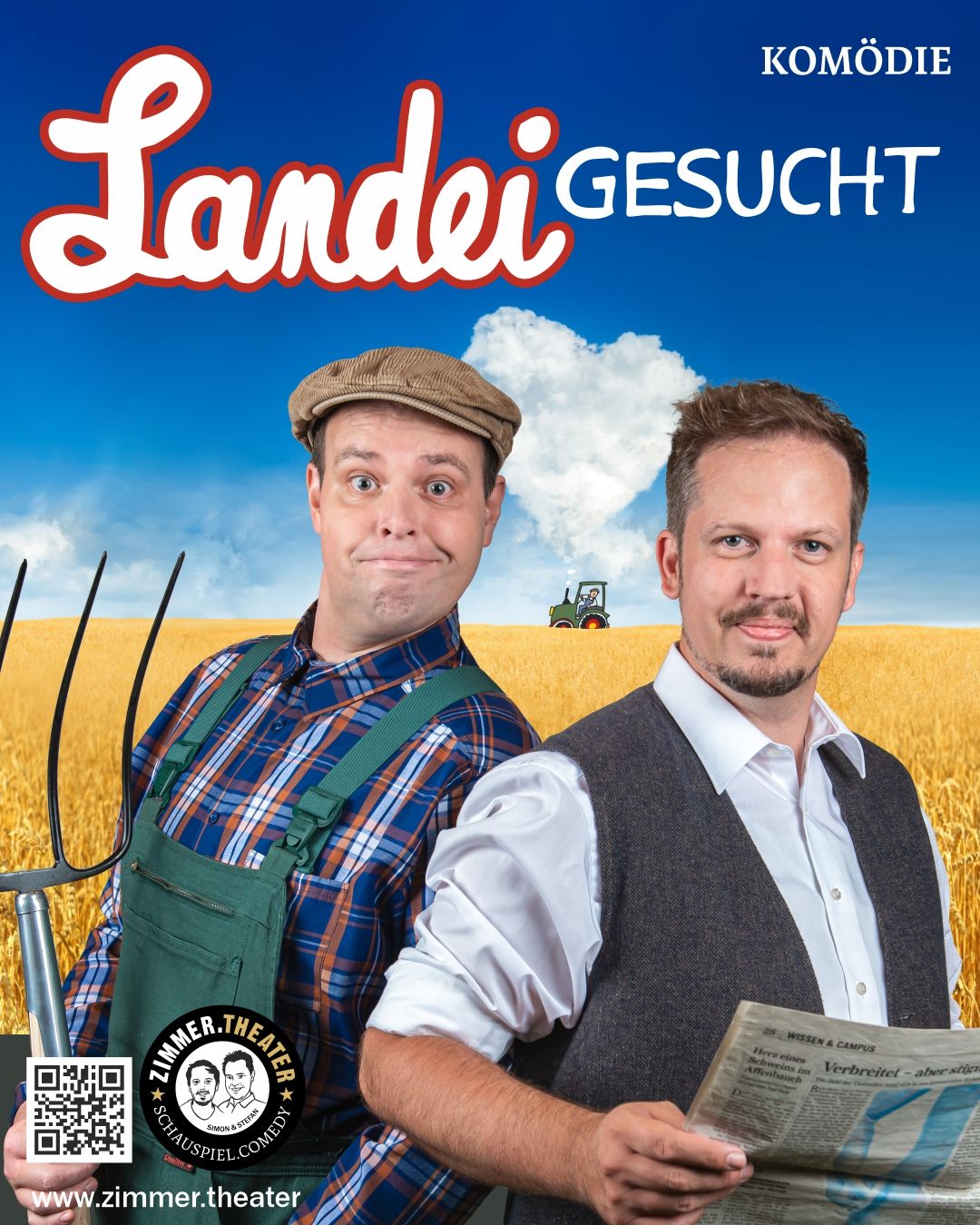 Theaterdinner "LANDEI GESUCHT" 70,- € pro Person (inkl. 3-Gang-Menü, Theaterprogramm, MwSt.) Schauspielkomödie vom ZIMMER.THEATER Bauer Erwin (Stefan Marx) ist deprimiert. Seit Jahren ist er vergebens auf der Suche nach einer passenden Frau. Die Dating-Komödie bei der gewiss kein Zuschauerauge trocken bleibt! Vergessen Sie Tinder und Co! Das inzwischen schon Kult-Stück vom ZIMMER.THEATER sollte man auf keinen Fall verpassen! ZIMMER.THEATER Simon Hillebrand und Stefan Marx sind ausgebildete Schauspieler und